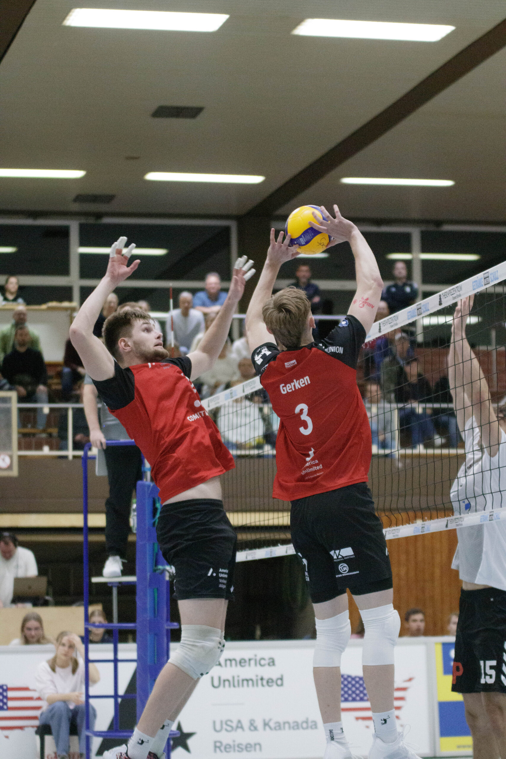 Foto im Text: Aligses Franz Hüther (li.) holt in Erwartung des Zuspiels von Mannschaftskapitän Benedikt Gerken (Nr. 3) mächtig aus – Foto: Matthias Frenzel / SFA