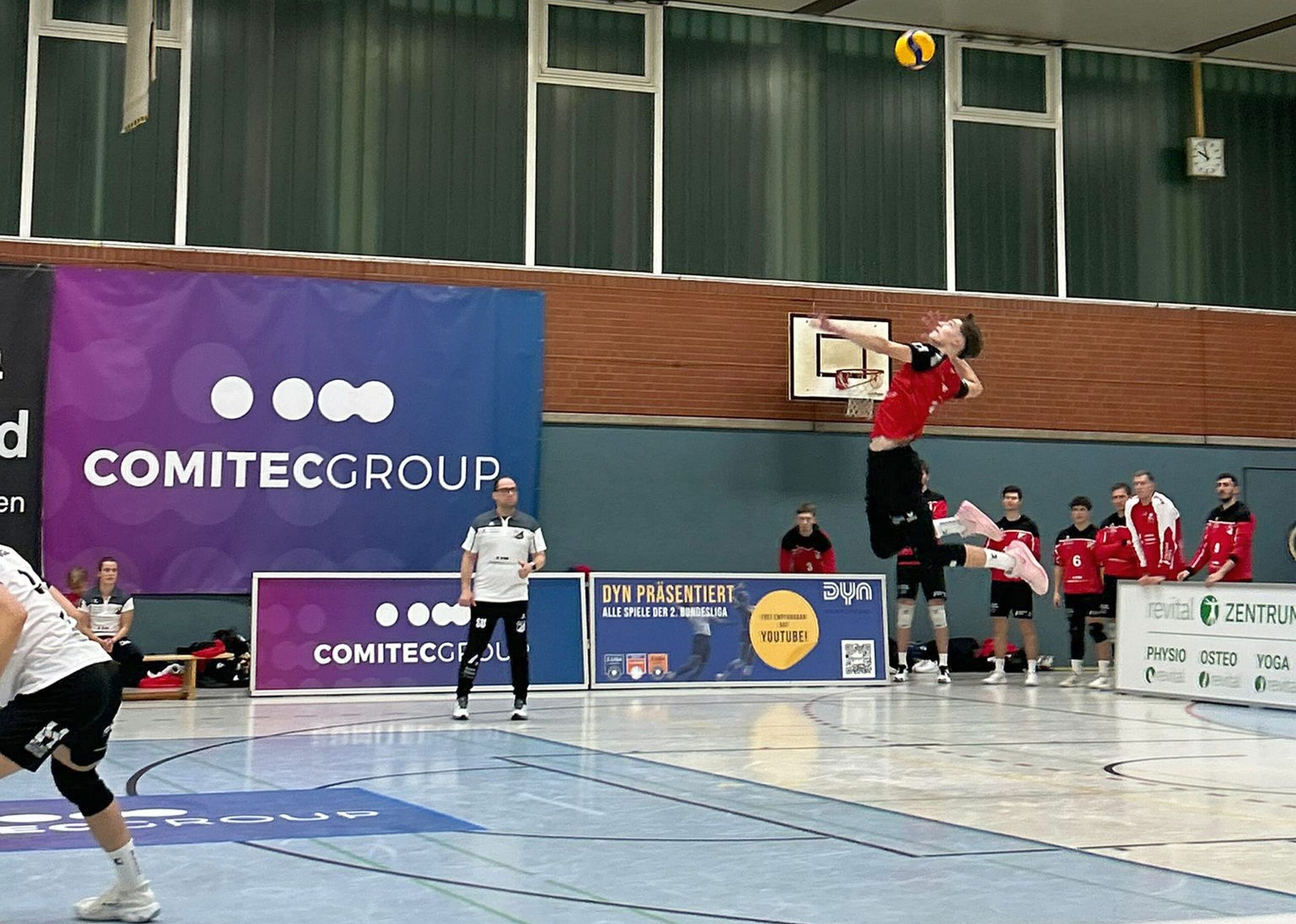 Titelbild: Tim Gebauer, hier beim Aufschlag, zeigte in Bocholt eine starke Leistung. Foto: Sarah Ohl (SF Aligse)